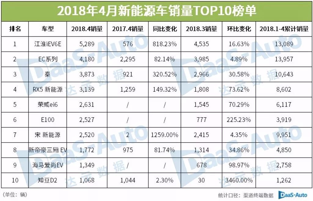其中江淮iEV6E在4月的表現相當出色,同比增長了818.23%,以5,289輛的成績榮膺榜首;與榜單中部分車型銷量翻幾番的增長相比,EC系列4月的同比增速放緩,上漲了82.14%至4,180輛,位列第二;比亞迪秦則排在第三位,同比增長320.52%,銷量為3,873輛。3月榜單中特斯拉上榜的兩款車型在4月均無緣進入前十。