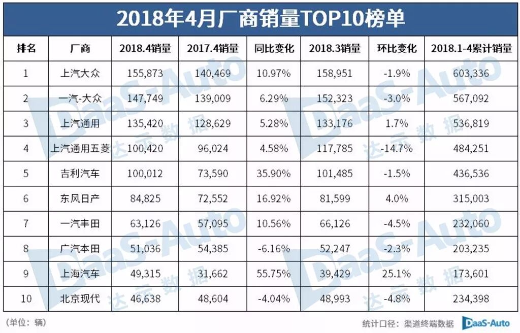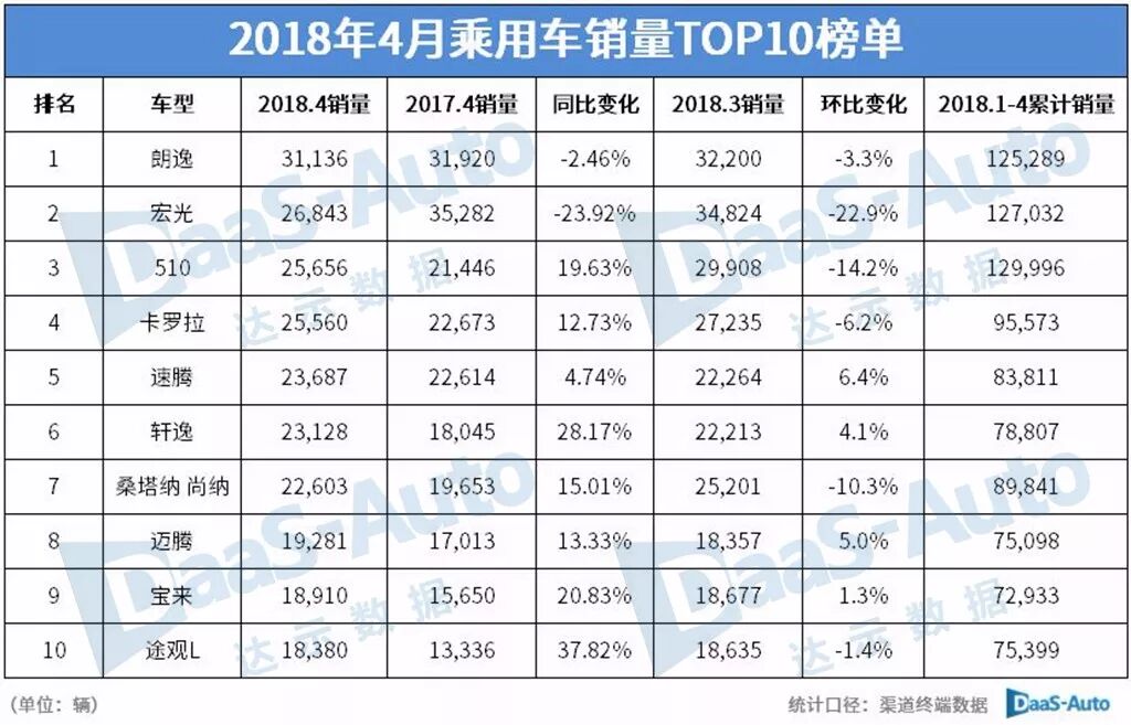 2018年4月乘用車銷量TOP10排行榜
